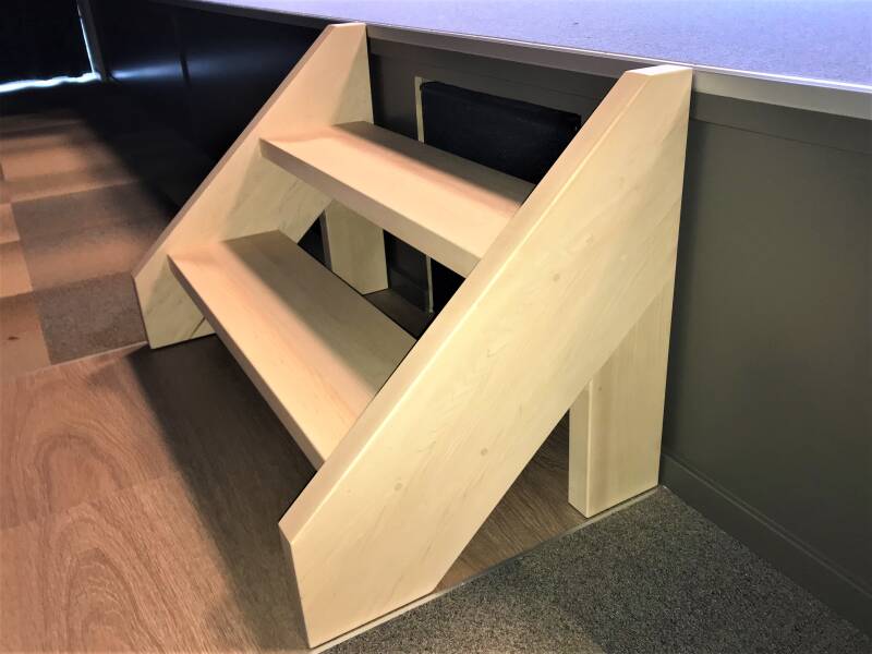 Voor het podium is een twee-treeds trap gemaakt. Er is gekozen voor blank esdoornhout, in aansluiting op de rest van het interieur. Als afwerking is Skylt orignal gekozen.