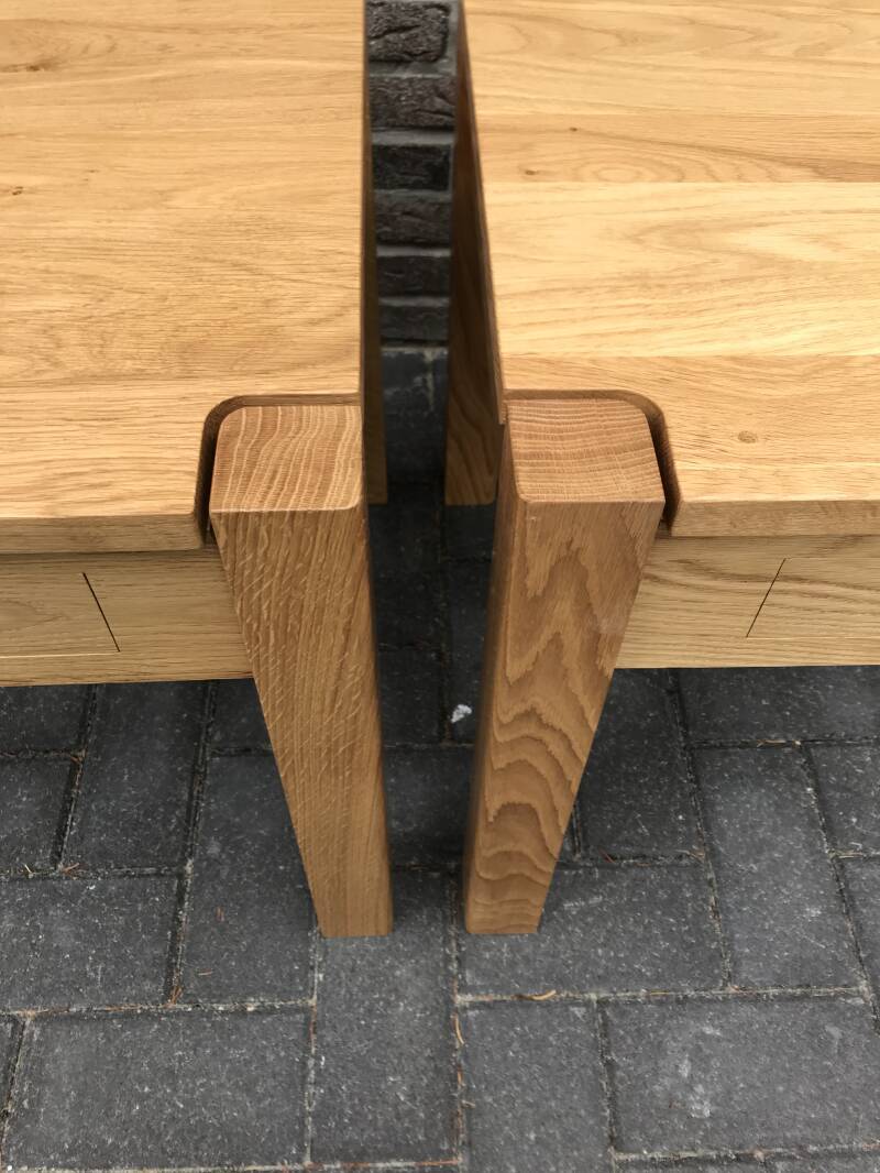De poten lopen door in het tafelblad en de bovenkant van de poten en bovenkant het tafelblad liggen exact in hetzelfde vlak. De hoeken van het blad zijn uitgefreesd en volgen de rondingen van de poten.