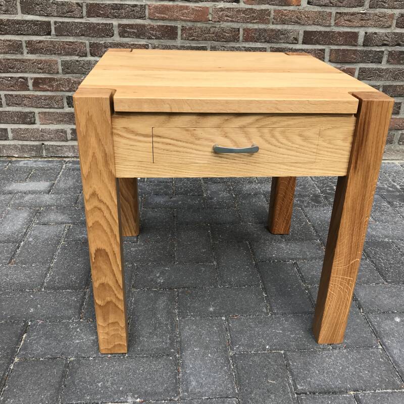 Beide tafels zijn voorzien van een schuiflade. De afwerking met een alu handvat geeft deze eikenhouten tafels een modern stak accent.